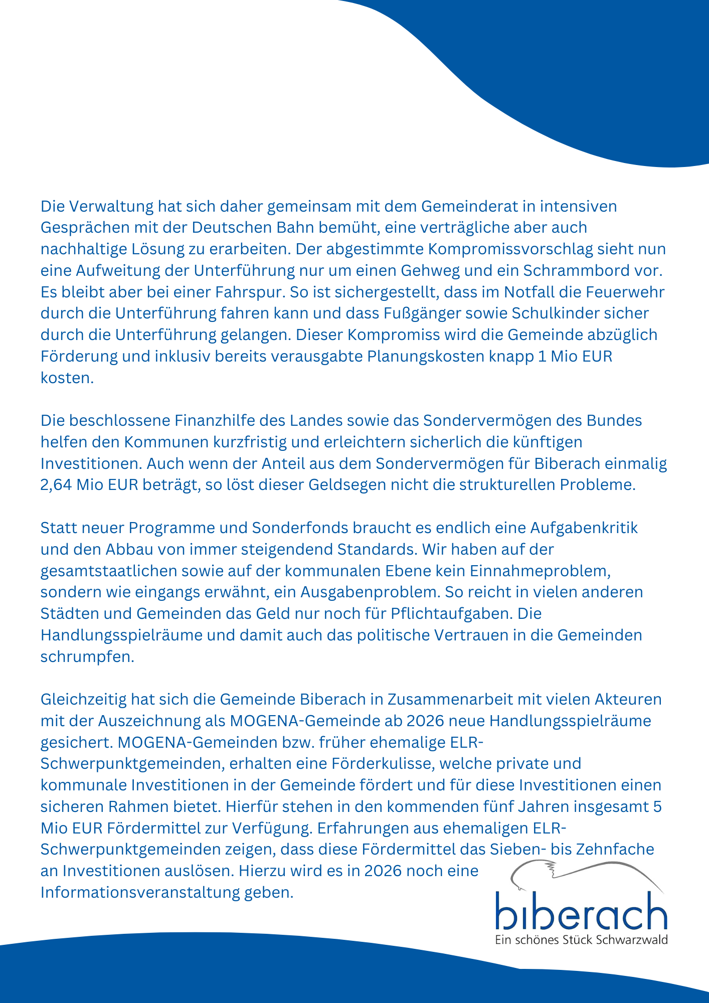 Gestern hat das Ministerium für Ernährung, Ländlichen Raum und Verbraucherschutz bekanntgegeben, dass die Gemeinde Biberach als eine von zwei Kommunen in Baden-Württemberg ab dem Jahr 2026 als „Modellgemeinde Nachhaltige Strukturentwicklung (MOGENA)“ anerkannt wurde. Der Gemeinde Biberach stehen damit in den nächsten 5 Jahren Fördermittel bis zu 5 Millionen Euro zur Verfügung. Die Anerkennung als MOGENA bietet ein enormes Entwicklungspotenzial für unsere Gemeinde. Gemeinwohlorientierte Projekte erhalten einen um 10% erhöhten Fördersatz und private Projekte genießen in diesem Zeitraum einen Fördervorrang gegenüber Projekten anderer Kommunen. Die Gemeinde Biberach möchte sich an dieser Stelle bei allen Bürgerinnen und Bürgern bedanken, die sich auf unseren damaligen Aufruf gemeldet haben. Sie haben maßgeblich zu der erfolgreichen Antragstellung beigetragen. Demnächst wird die Gemeinde weitere detaillierte Informationen zum weiteren Ablauf bekanntgeben. Die Pressemitteilung von Herrn Minister Peter Hauk zur MOGENA-Entscheidung ist außerdem unter folgendem Link abrufbar: https://mlr.baden-wuerttemberg.de/de/unser-service/presse-und-oeffentlichkeitsarbeit/pressemitteilungen/pressemitteilung/pid/modellgemeinden-nachhaltige-strukturentwicklung-mogena-ausgewaehlt