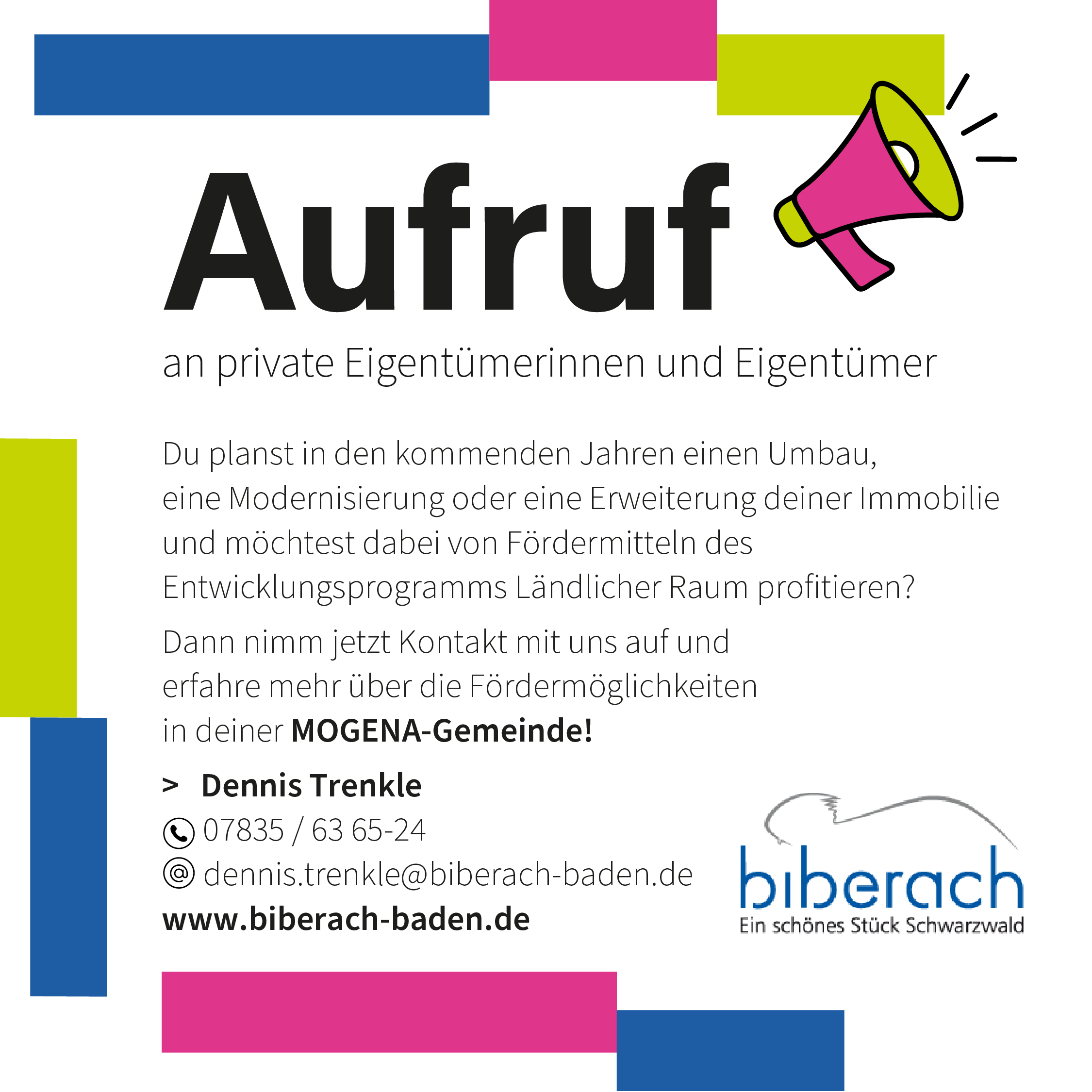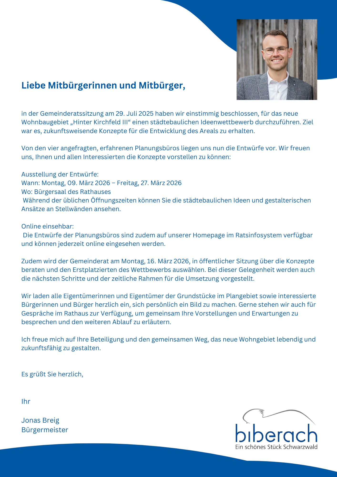 Gestern hat das Ministerium für Ernährung, Ländlichen Raum und Verbraucherschutz bekanntgegeben, dass die Gemeinde Biberach als eine von zwei Kommunen in Baden-Württemberg ab dem Jahr 2026 als „Modellgemeinde Nachhaltige Strukturentwicklung (MOGENA)“ anerkannt wurde. Der Gemeinde Biberach stehen damit in den nächsten 5 Jahren Fördermittel bis zu 5 Millionen Euro zur Verfügung. Die Anerkennung als MOGENA bietet ein enormes Entwicklungspotenzial für unsere Gemeinde. Gemeinwohlorientierte Projekte erhalten einen um 10% erhöhten Fördersatz und private Projekte genießen in diesem Zeitraum einen Fördervorrang gegenüber Projekten anderer Kommunen. Die Gemeinde Biberach möchte sich an dieser Stelle bei allen Bürgerinnen und Bürgern bedanken, die sich auf unseren damaligen Aufruf gemeldet haben. Sie haben maßgeblich zu der erfolgreichen Antragstellung beigetragen. Demnächst wird die Gemeinde weitere detaillierte Informationen zum weiteren Ablauf bekanntgeben. Die Pressemitteilung von Herrn Minister Peter Hauk zur MOGENA-Entscheidung ist außerdem unter folgendem Link abrufbar: https://mlr.baden-wuerttemberg.de/de/unser-service/presse-und-oeffentlichkeitsarbeit/pressemitteilungen/pressemitteilung/pid/modellgemeinden-nachhaltige-strukturentwicklung-mogena-ausgewaehlt