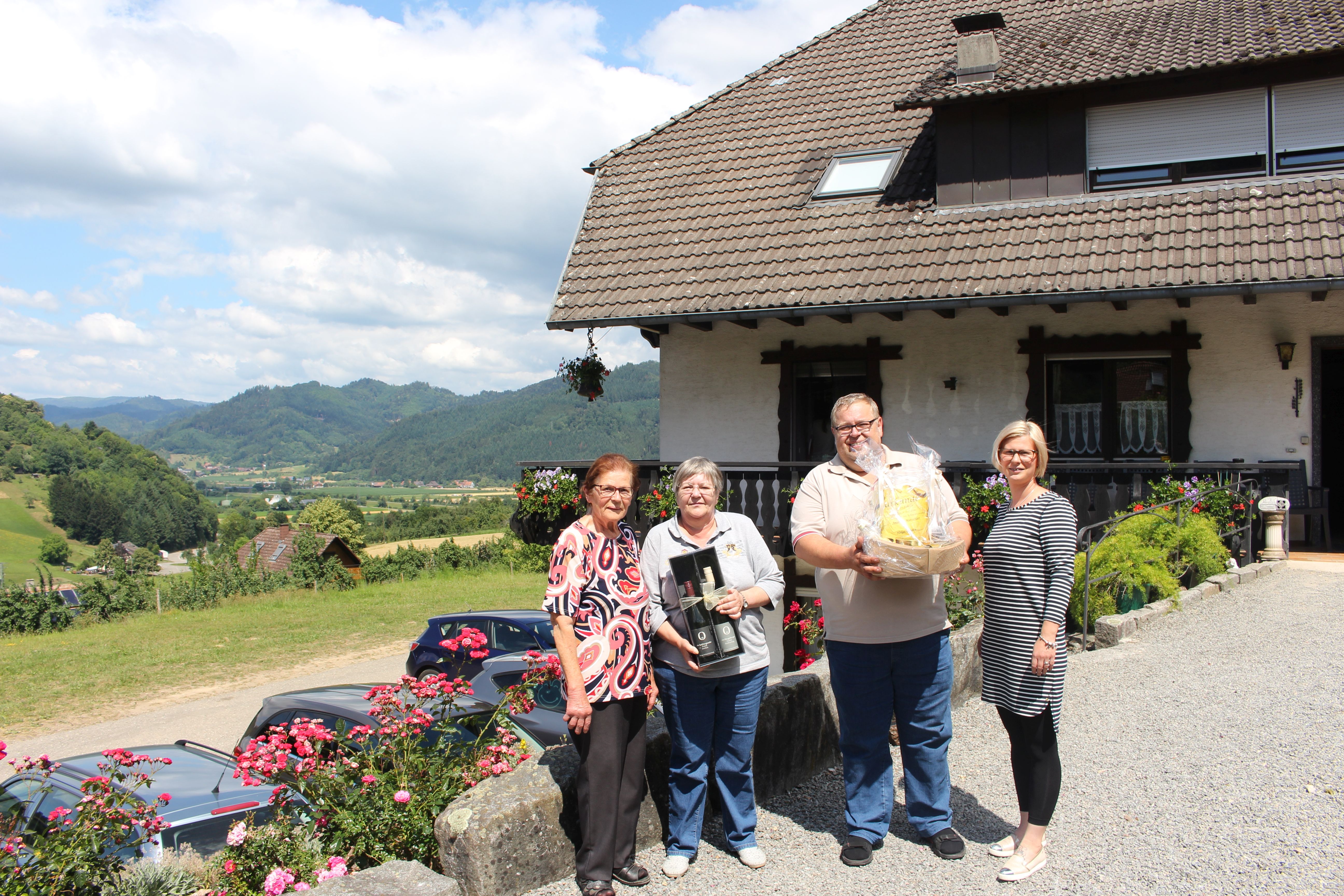 Die Mitarbeiterin der Tourist-Information durfte stellvertretend die Dankesworte im Namen der Gemeinde Biberach übermitteln und für sage und schreibe 40 Jahre Urlaubsaufenthalt im Erholungsort Biberach danken. Sie erwähnte in Ihrer Ansprache, dass diese hohe Zahl schon etwas Besonderes sei. In einer kleinen Feierstunde bei Kaffee und Kuchen überreichte Sie dem Ehepaar Stolz die obligatorische Urkunde, ein Sektpräsent, ein Genießer-Vesperbrett, sowie heimischen Honig. Mit einem Geschenkkorb bedankten sich auch die Gastgeber bei ihren langjährigen Gästen und man spürte die Freundschaft zwischen Familie Breig und dem Ehepaar Stolz.