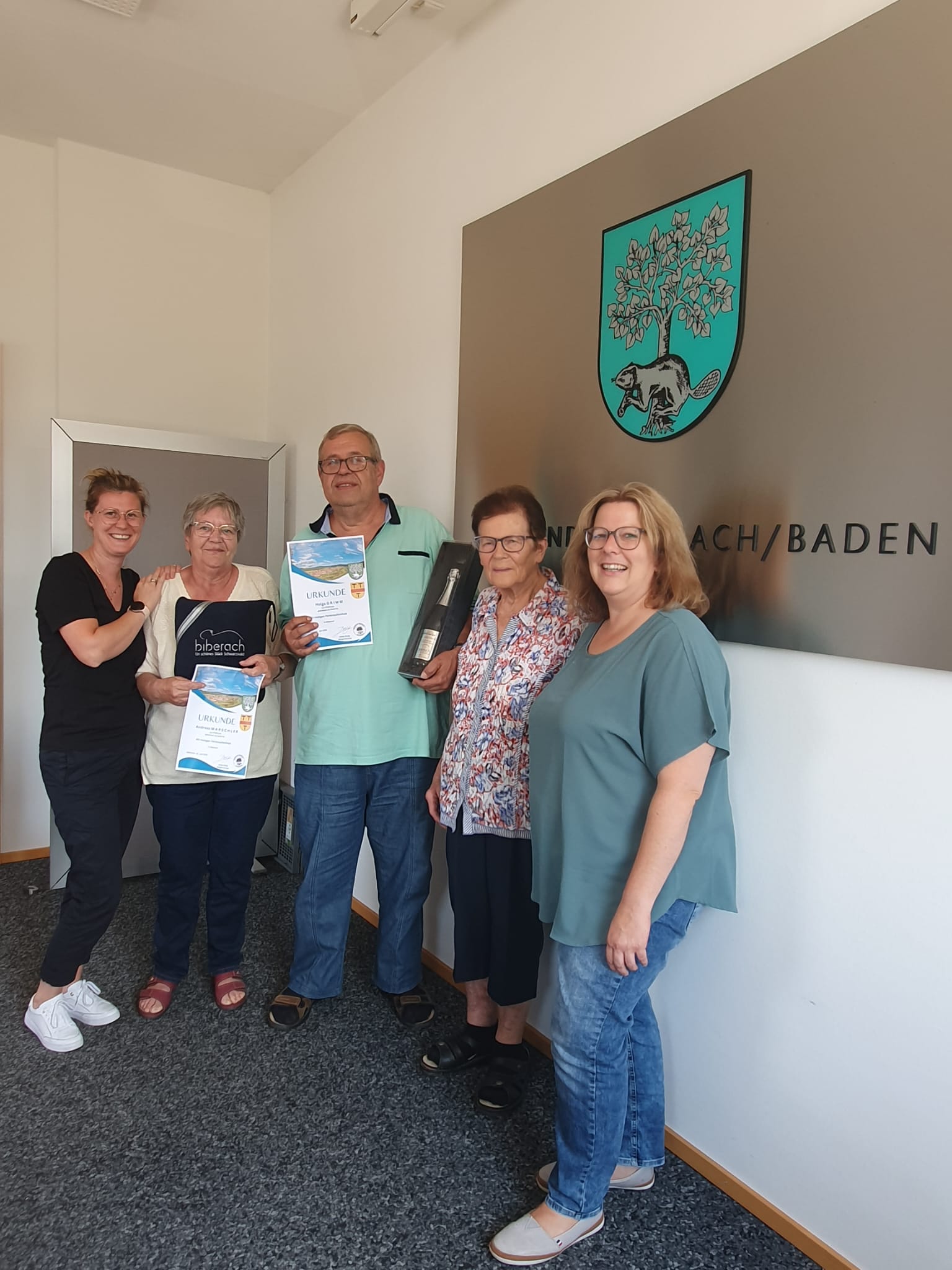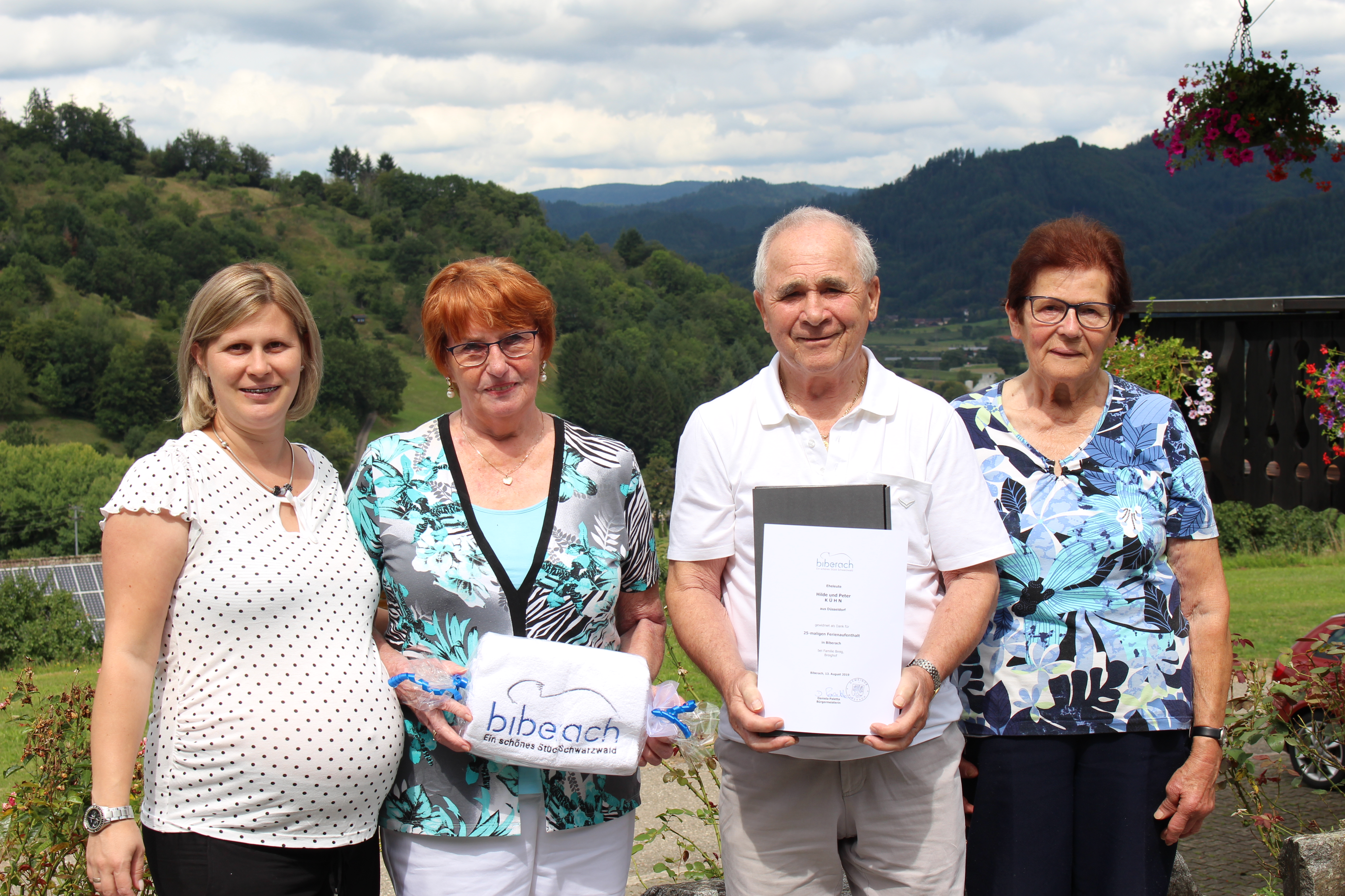 Sandra Armbruster von der Gemeinde Biberach begrüßte die Feriengäste zusammen mit Alexandra und Brunhilde Breig vom Breighof in den Räumen der Gemeinde Biberach und dankte den Ehrengästen mit einer Urkunde und einem Präsent für den 25-jährigen Aufenthalt. Nicht nur die Gemeinde hofft auf viele weitere Urlaub im Erzbach. Auch die Gastgeberfamilie Breig freut sich über den jährlichen Besuch der beiden.