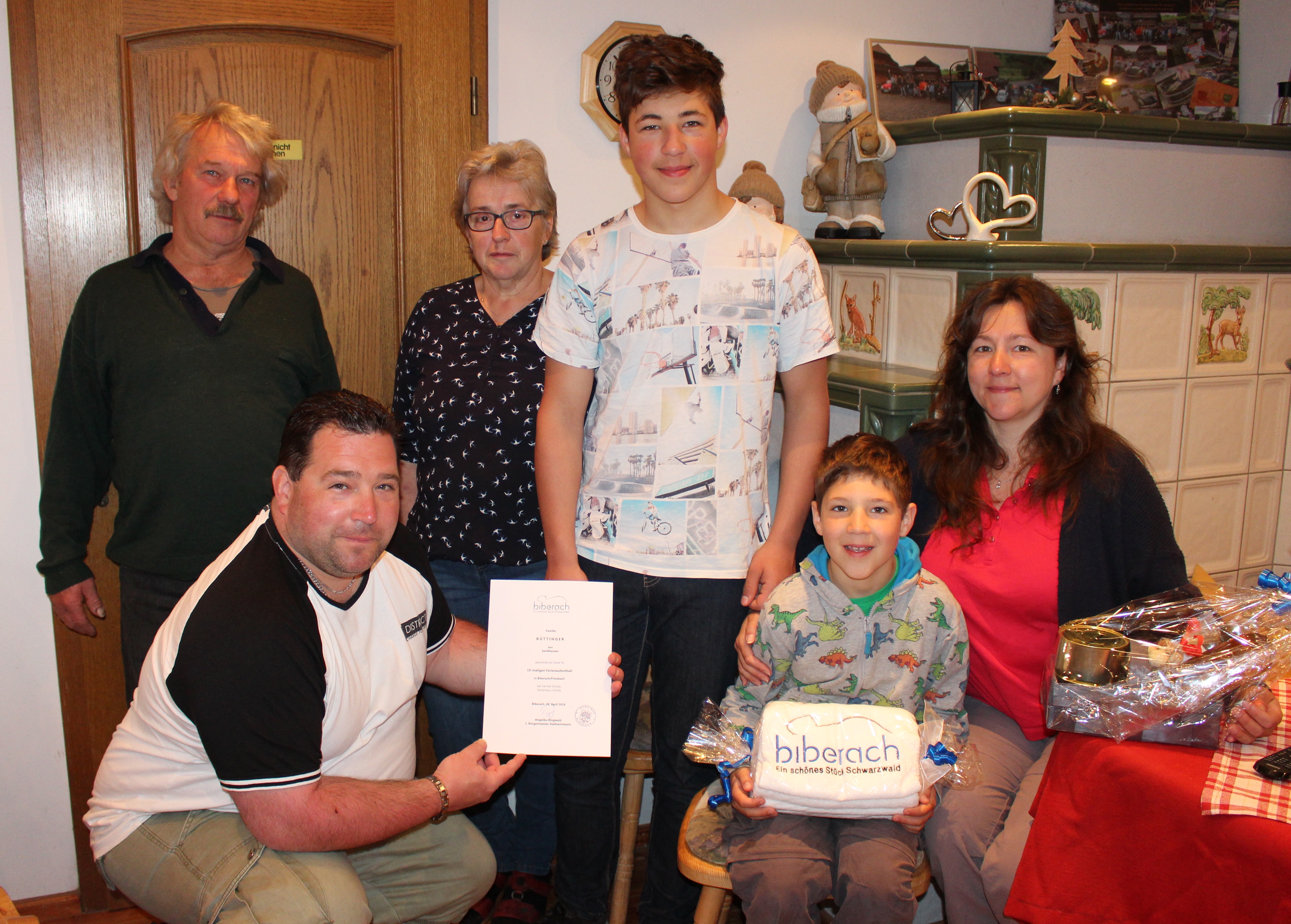 Seit 25 Jahren verbringen Eheleute De Wolf aus den Niederlanden mit ihren 6 Kindern und mittlerweile auch einem Schwiegersohn, regelmäßig im Sommer ihren Urlaub auf dem Breighof in Biberach. Herr De Wolf erzählte, dass er durch eine Empfehlung von einem seiner Jägerkollegen auf dem Breighof in Biberach gelandet ist und der Region, wie der Familie Breig bis heute treu geblieben ist. Er kommt mit seiner Familie, welche im Lauf der Jahre immer größer wurde, immer im Sommer zum Erholen nach Biberach. Sie schätzen die Ruhe, Natur und den Wald. Da es keinen Durchgangsverkehr bei Familie Breig gibt, konnten die Kinder als Sie noch kleiner waren unbeschwert toben und rennen. Natürlich wandern sie gerne, jedoch war es ihnen dieses Jahr etwas zu heiß. Sie kühlen sich im Schwimmbad ab und natürlich wird auch jedes Jahr ein Ausflug gemacht – dieses Jahr besichtigten sie Burg Hohenzollern. Ganz besonders schätzt Familie De Wolf die Gastfreundschaft, die Hilfsbereitschaft und die Zeit die man sich für die Gäste nimmt. Für die Familie De Wolf ist Biberach beziehungsweise der Breighof eine zweite Heimat geworden. Für die Kinder ist Frau Breig Senior inzwischen fast wie eine Oma geworden. Herr de Wolf betont, dass wenn man etwas sehen will, braucht man Zeit und dies haben sie hier. Er darf auch immer mit Herrn Breig auf die Jagd und erzählte, dass er auch gestern einen „Bock“ geschossen hat und als er abends auf dem Balkon saß hat er einen Fuchs gesehen. Sie lobten das sehr gute Frühstück und Sie lieben das Essen in unserer Region, da waren sich alle einig. Silke Schülli von der Touristen-Information sprach Dank und Anerkennung aus und überreichte der Familie de Wolf zum Anlass des 25-jährigen Jubiläums eine Urkunde und ein Präsent. Ein weiterer Dank galt den langjährigen Gastgebern, der Familie Breig. Diese bedankte sich ebenso bei der Familie de Wolf mit Urkunde und einem Geschenkkorb. Anschließend wurde in geselliger Runde mit einem Glas Sekt angestoßen.