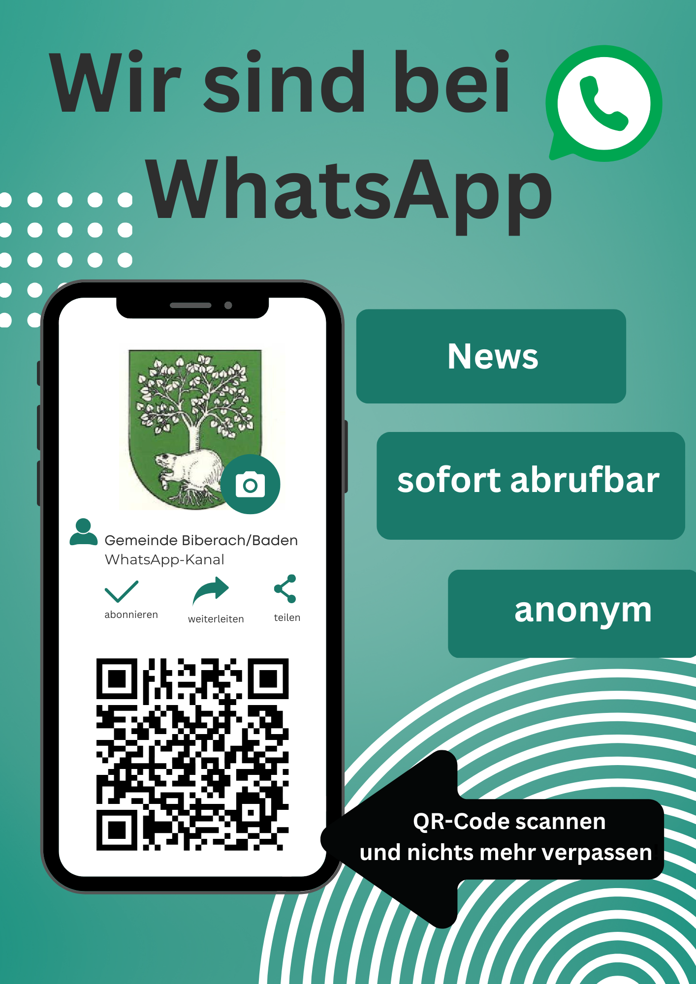 Die Gemeinde Biberach bietet die Möglichkeit, aktuelle Informationen bequem über einen WhatsApp-Kanal zu erhalten. Auf diesem Weg informieren wir Sie über wichtige Mitteilungen, amtliche Bekanntmachungen, Termine und Veranstaltungen sowie Wissenswertes aus dem Gemeindeleben.